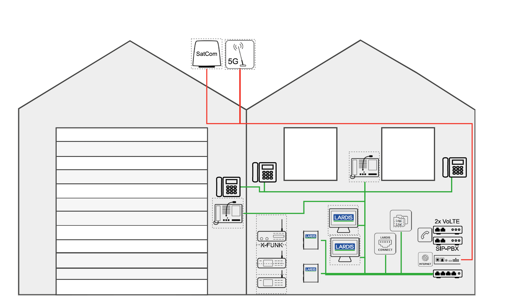 Die Einsatzzentrale ist mit min. einem LARDIS-Funkarbeitsplatz ausgestattet und kann auf bis zu 16 LARDIS-Funkarbeitsplätze ausgebaut werden. Darüber hinaus können spezielle LARDIS-Sprechstellen für Büroarbeitsplätze oder Fahrzeughallen eingebunden werden. Ebenso ist die Anbindung an die hauseigene Telefon- und ELA-Anlage und Haustechnik möglich.